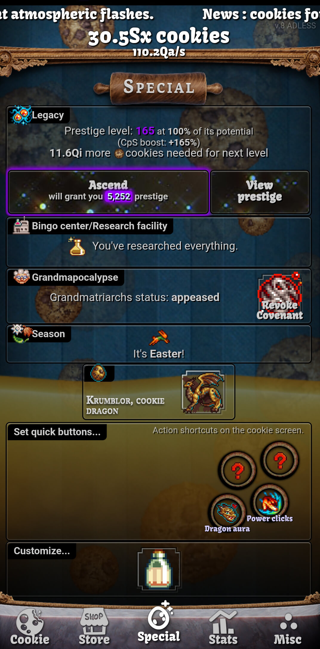 I deleted my game file 400 days ago, started a new one, then forgot about it until last month. But knowledge of past lives has made this playthrough a lot more efficient. I was gonna ascend at x777 but I keep missing it because I get a dragon flight or some other thing, so I'm not sure when I'll do my next ascension but as of this morning I'm at 6662 prestige so it's gonna be a good one.