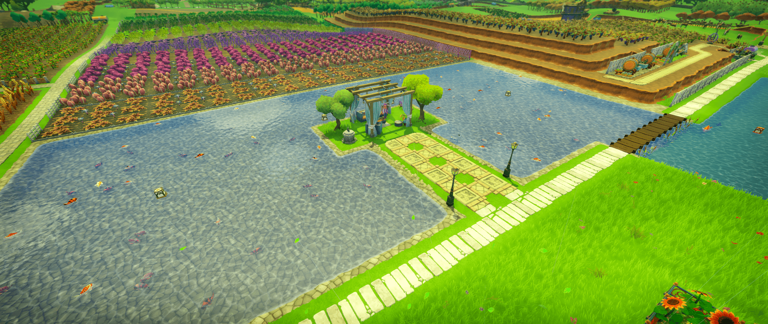 Lets see what else. Oh I finally found a reasonable aesthetic solution for my koi ponds, for now. I've fussed with that area a great deal, originally playing around with linked bridges and other things. Having a peninsula terrace works for now.