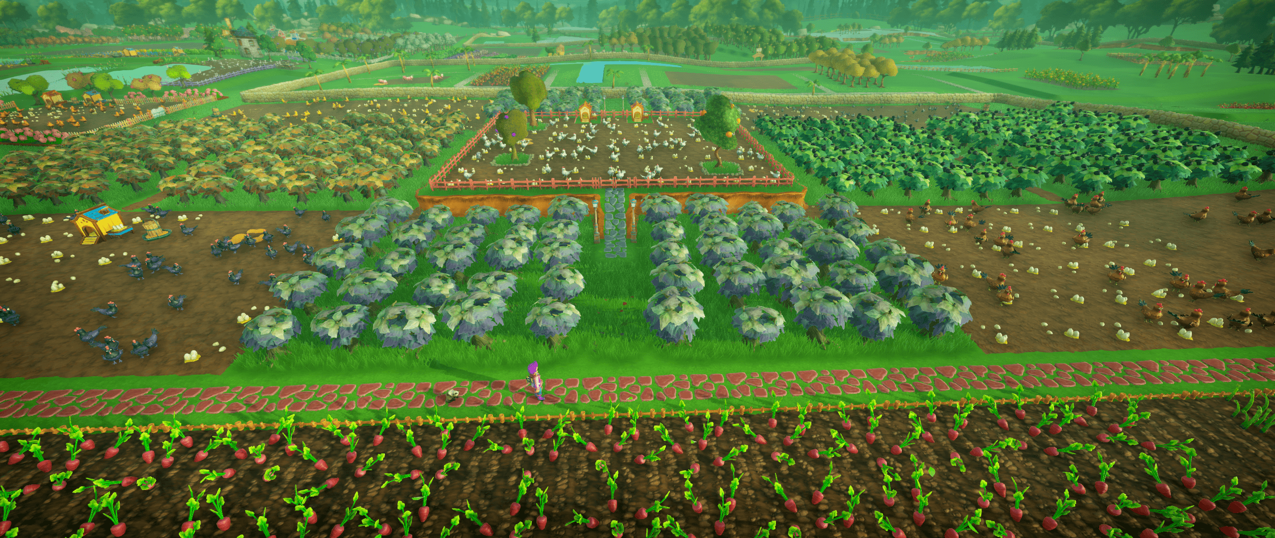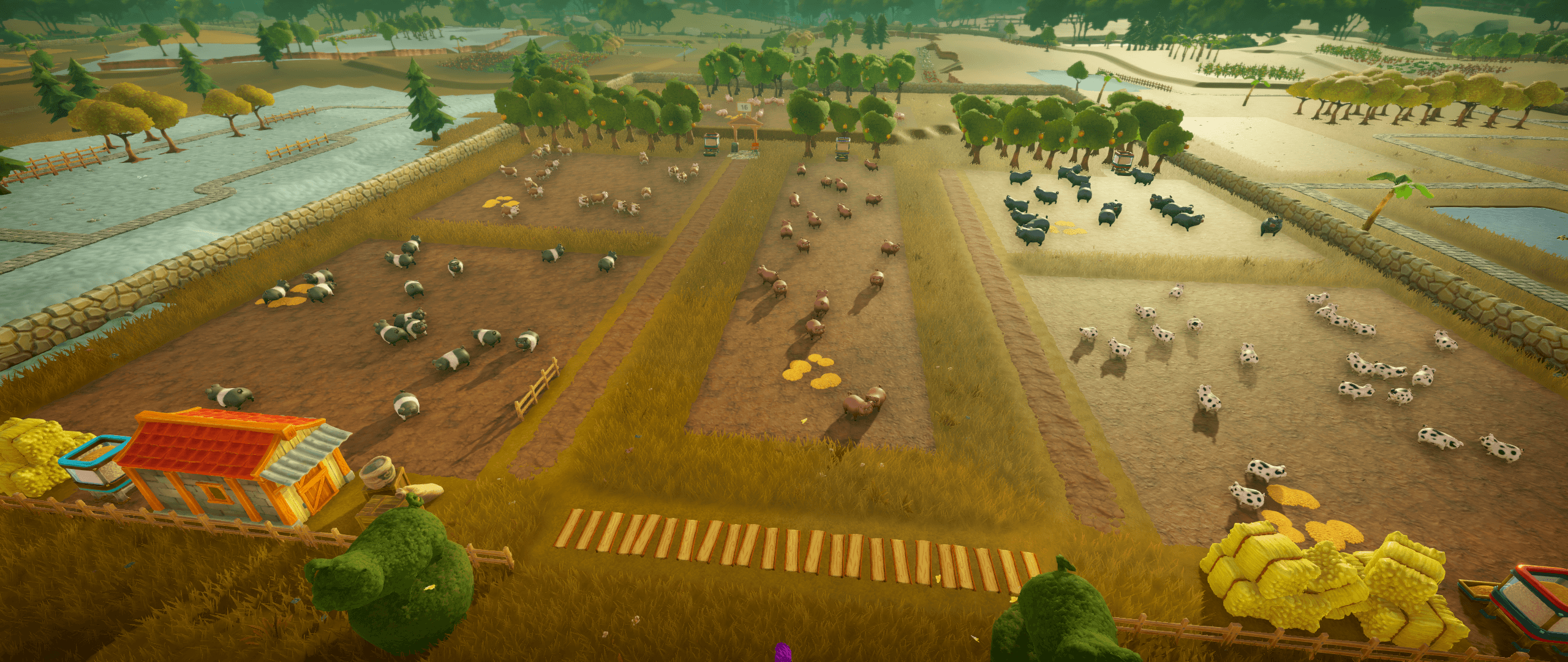 I got the idea to do a chicken/shrub "checkerboard", the idea is to use trees, flowers, etc., as natural fences. At the very least, it provides visual interest and helps break up the sections. With the pigs... IDK man I don't really like pigs! But I came up with a grid area that can be expanded easily when I unlock the plots on either side.