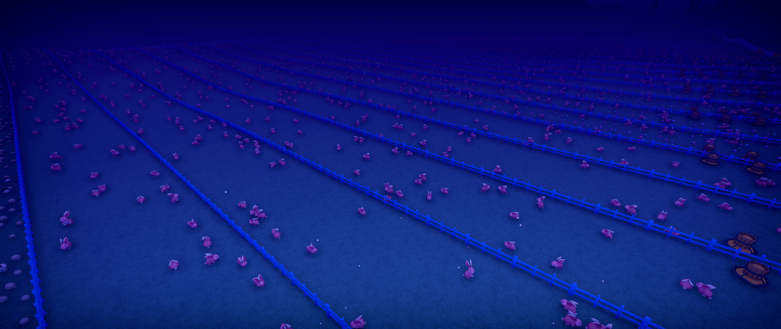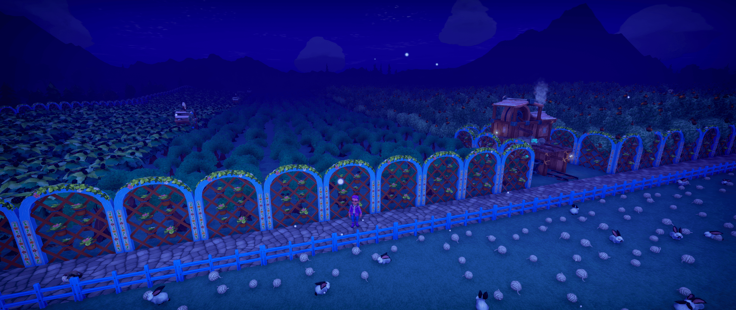 I've been exploring megafarms and finding interesting features. In this one, the owner has fenced off part of their farm with farmhands and orchards to keep normies from interfering. With what, I couldn't say, since they're orchards! But it demonstrates different ways you can have a farm that caters to visitors and still have private areas without having to set up a million permission booths.