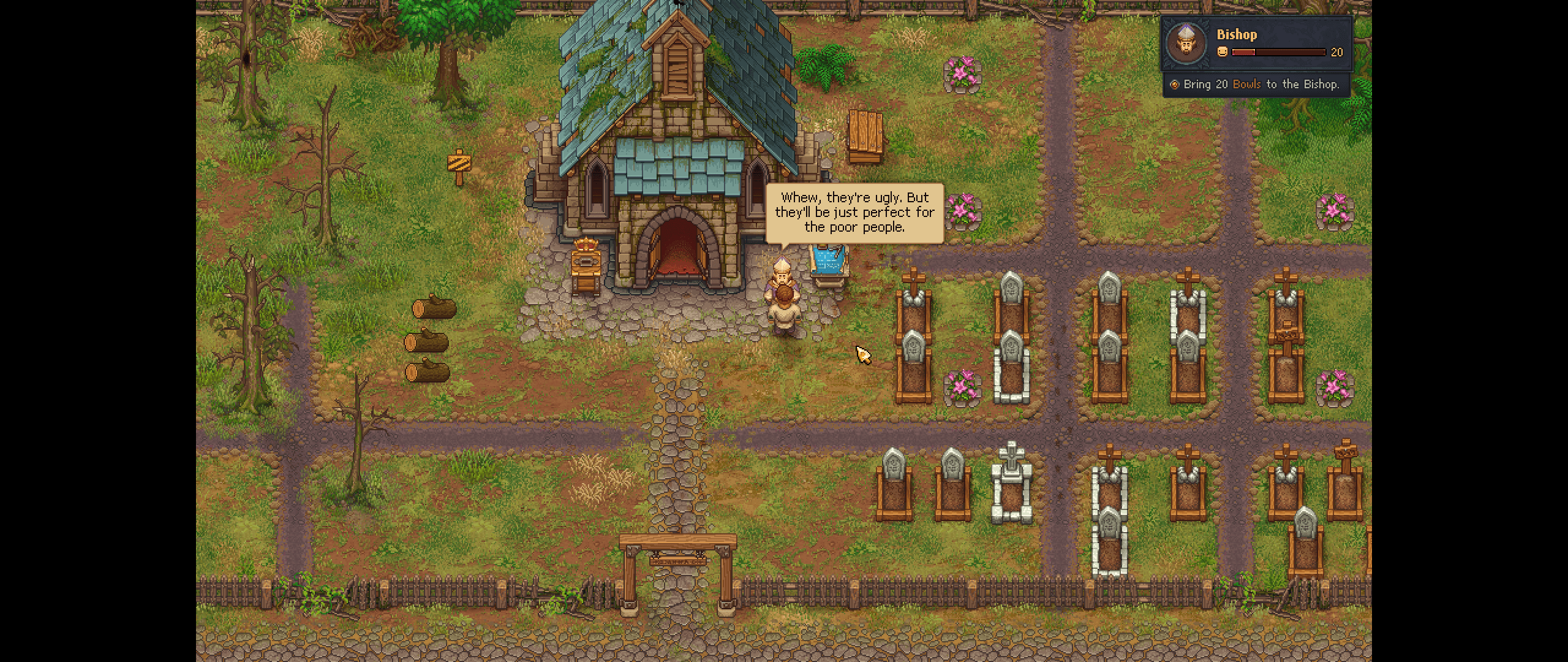 I finally upgraded my church but just baaarely missed the bishop's visit, so I gotta wait a week, but that's fine. I'm probably going to start working on glass next, since I read you can study glass flasks for a good source of blue points. I am REALLY ready to upgrade my sermons, but it's a somewhat convoluted crafting process where I have to make paper, create notes, use "stories" which are basically like a writing creative essence, bind those into chapters, THEN make a new sermon book. The bishop has sermons for sale but I couldn't figure out how to buy them so IDK. I also have to figure out fishing, there's ZERO explanation of the mechanics but I've got a ton of maggots which I'm sure I can use as bait.