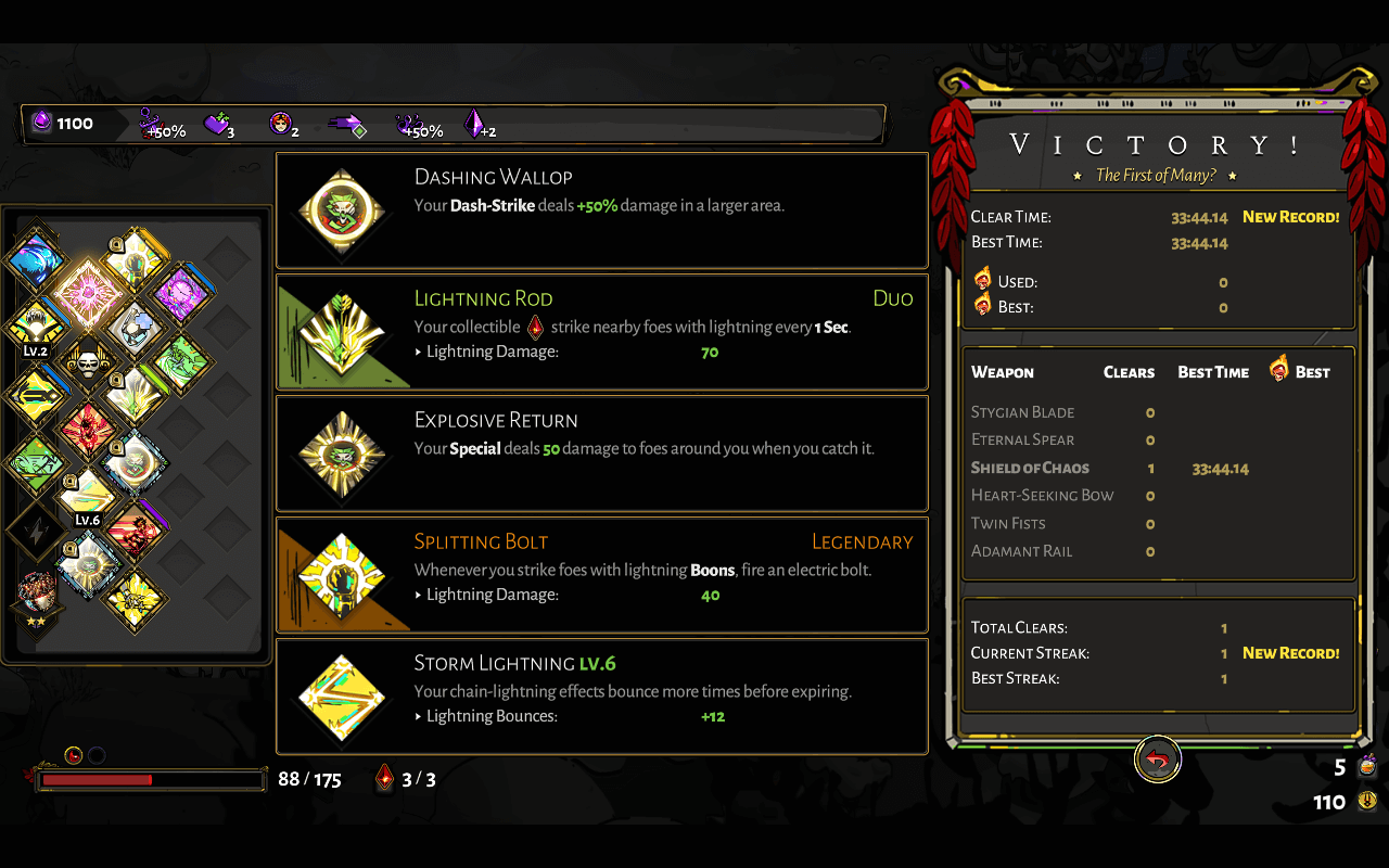 Ironically, I'd started this run thinking I'd take a break from the game for a while, and I almost quit early on because I felt like I got a bad start, but I snagged some complimentary boons that ended up being OP and let me focus entirely on dodging while spamming cast. I had no right to finish as strong as I did, but that's the RNG folks.