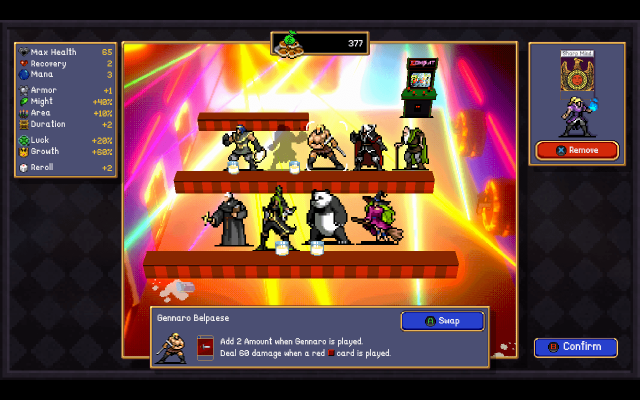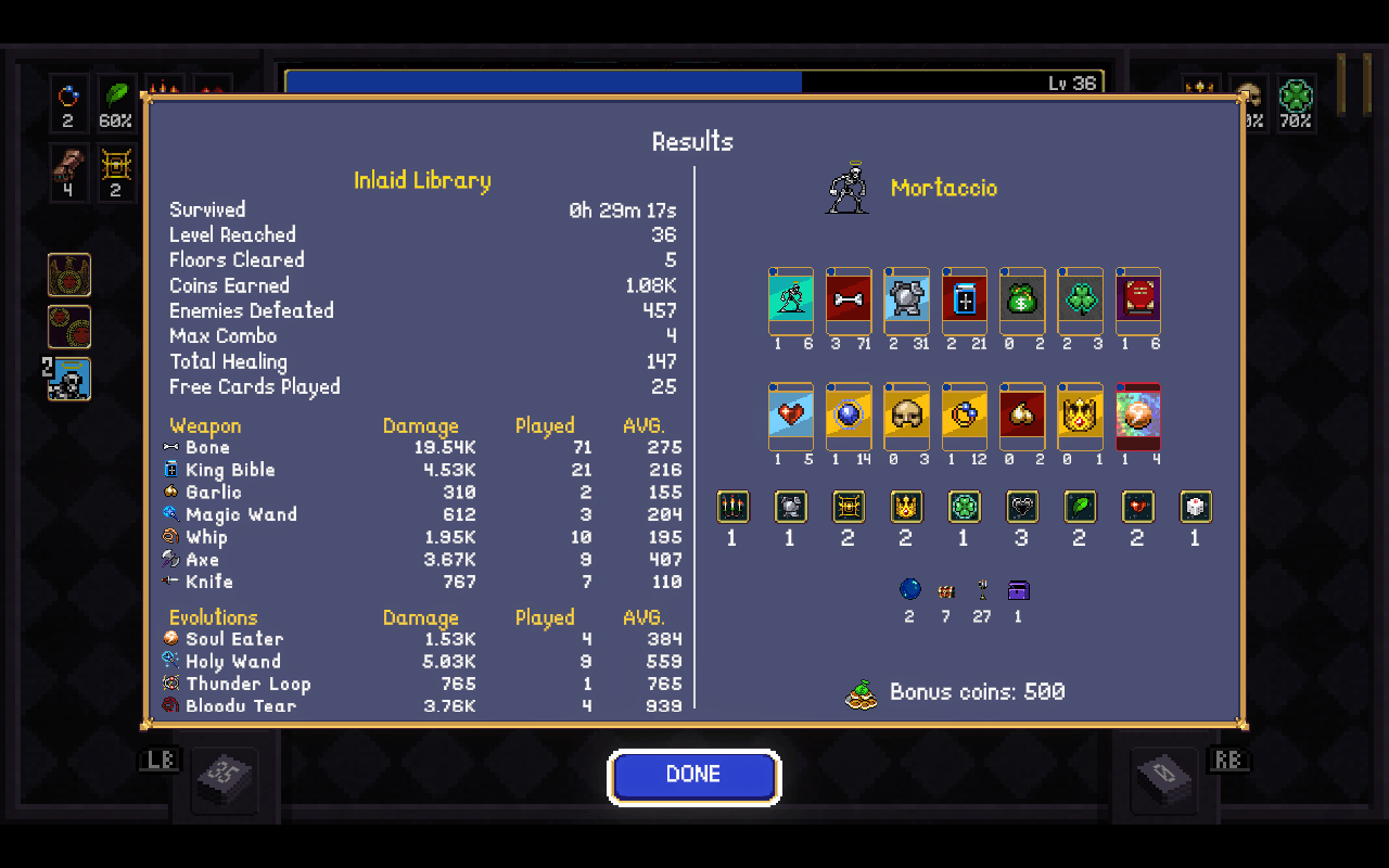 Spellbinder and Unholy Bible can evolve into Vespers, which is a cool card, but in the future I wouldn't sacrifice Spellbinder until I had at least 2 of them or a handful of yellow 0 cards. I haven't unlocked Spellbinder for pickups yet, according to the wiki I need to play runetracer 10 times which I evidently haven't done. Consulting the wiki leads down a rabbit hole... I need Pasqualinia at level 10 to unlock runetracer, and to do that I need to get Imelda to level 20 in the library. I can't remember who I've unlocked but unlocking spellbinder is my next session goal.